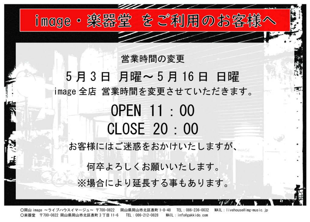 5月3日(月)〜5月16日(日)の間、営業時間を下記のように変更させていただきます。